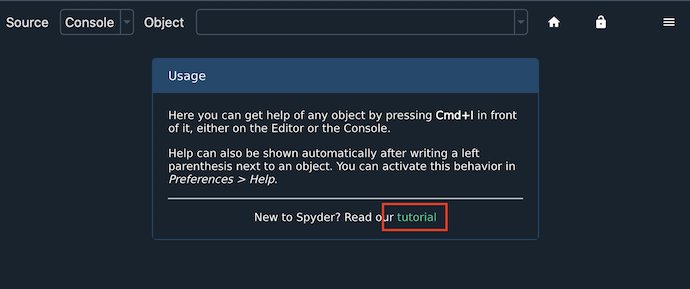 You can also access Spyder’s tutorial from here, which will guide you through some basic steps for using its key features.