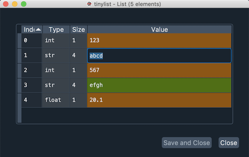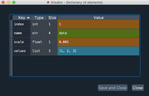 For lists, the main Variable Explorer displays a preview of the first ten values. To see them all, double click the list to open a viewer that will display the index, type, size and value of each element of the list. Just like dictionaries, you can double-click values to edit them.